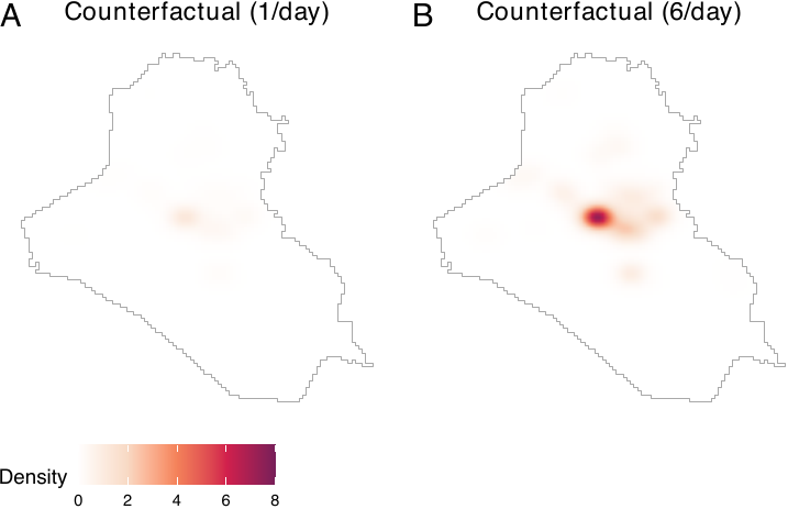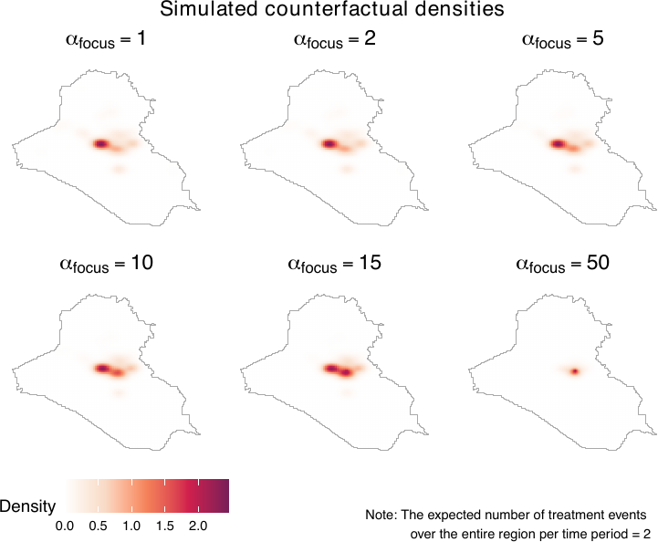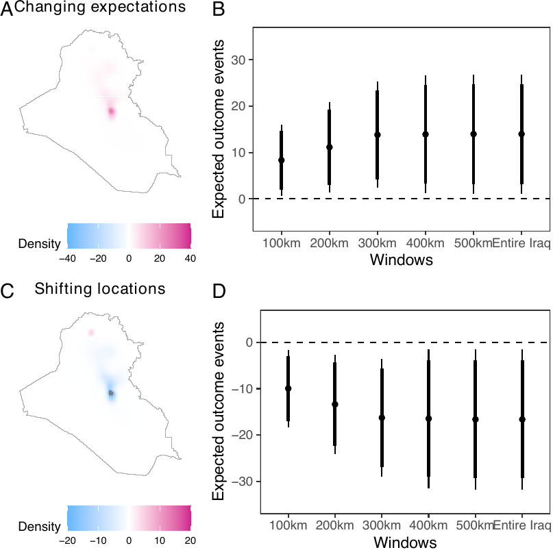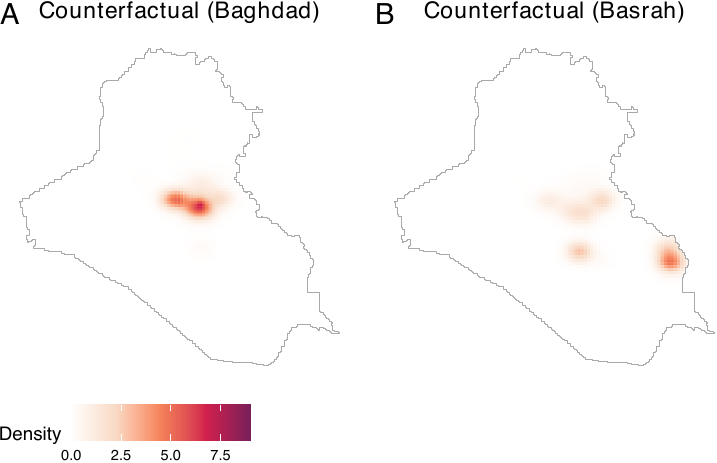 The causal contrasts comparing scenarios with different expected numbers of airstrikes replicate the results by Papadogeorgou et al. (2022). Readers should note that, in this paper, we included an indicator for a surge of airstrikes, we used a different version of the spatstat package, and we project the location information. The result shows that increasing the expected number of airstrikes results in increased insurgent activities. Shifting the focus from Baghdad to Basrah while maintaining a constant number of airstrikes results in a decrease in insurgent activities.