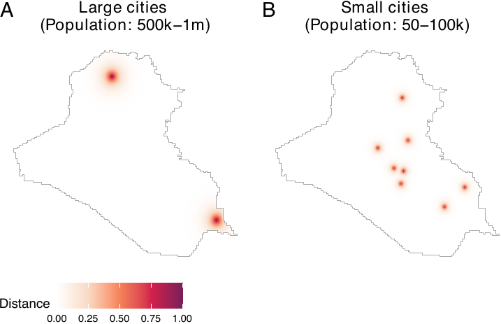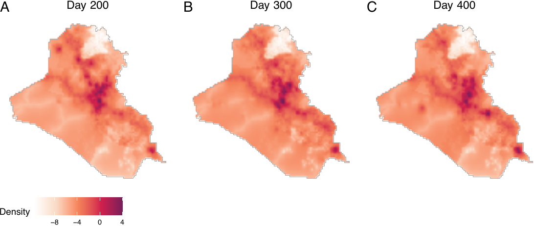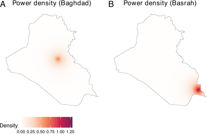 To execute adaptive smoothing, the smooth_ppp() function adopts the method proposed by Abramson (1982). The geocausal package assumes that the bandwidth is inversely proportional to the square root of the target densities. Users can apply this adaptive-bandwidth approach by setting method = "abramson". For example, to smooth the locations of insurgent attacks, users can execute the following code.