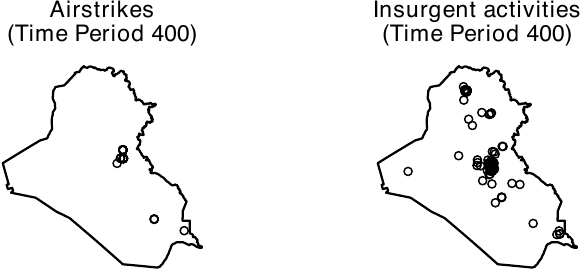 Visualization of the hyperframe. The plot (left) shows the locations of airstrikes on day 400 and the plot (right) depicts the locations of insurgent attacks on the same day.